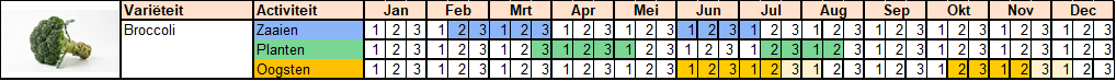 In de Tuinagenda vind je twee perioden die geschikt zijn voor het zaaien van broccoli. Er is een zomeroogst en een herfstoogst. Door vroege en late oogsten te combineren, kun je de oogstperiode van broccoli Calabrese verlengen.